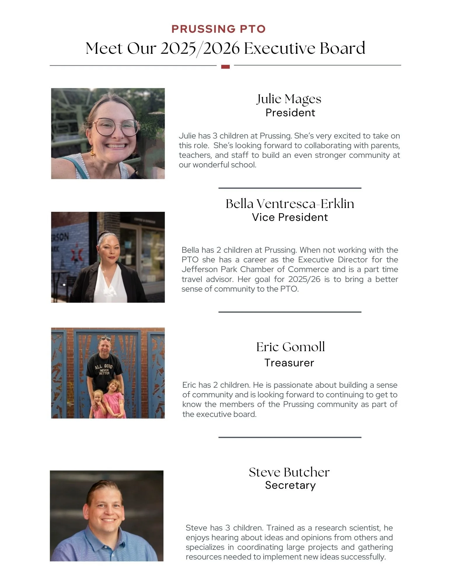 Our PTO Board works together to plan/facilitate monthly meetings, plan events, work with teachers/staff, make PTO decisions, and to approve funding for staff needs.