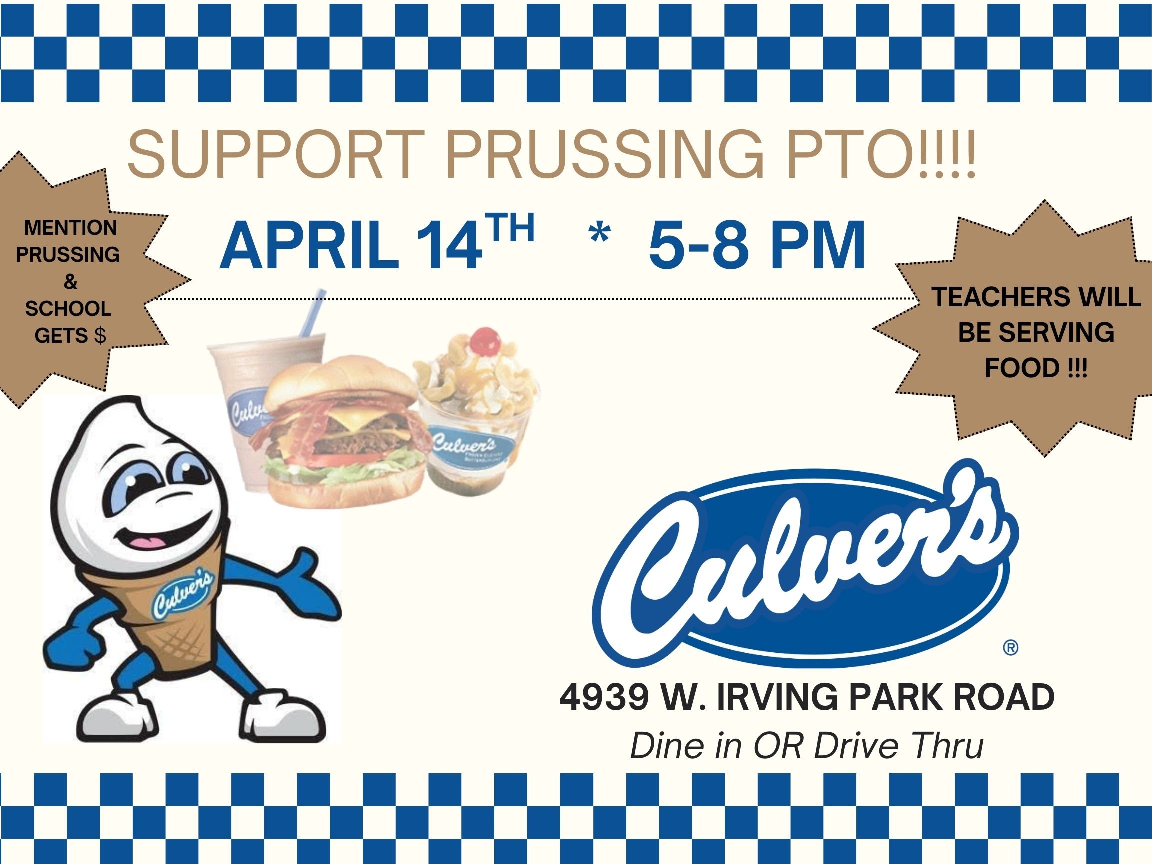 Back to All Events Culvers Prussing Staff & Family Night Tuesday, April 14, 2026 5:00 PM 8:00 PM Culvers 4939 West Irving Park Road Chicago, IL, 60641 United States (map) Google Calendar ICS Click Here to Volunteer at Event Come meet us your teachers, staff, and friends for dinner at Culvers! Dine in or Drive Thru! Be sure to mention Prussing School so they donate 20% of your sales to Prussing PTO.Hope to see you there for the fun!