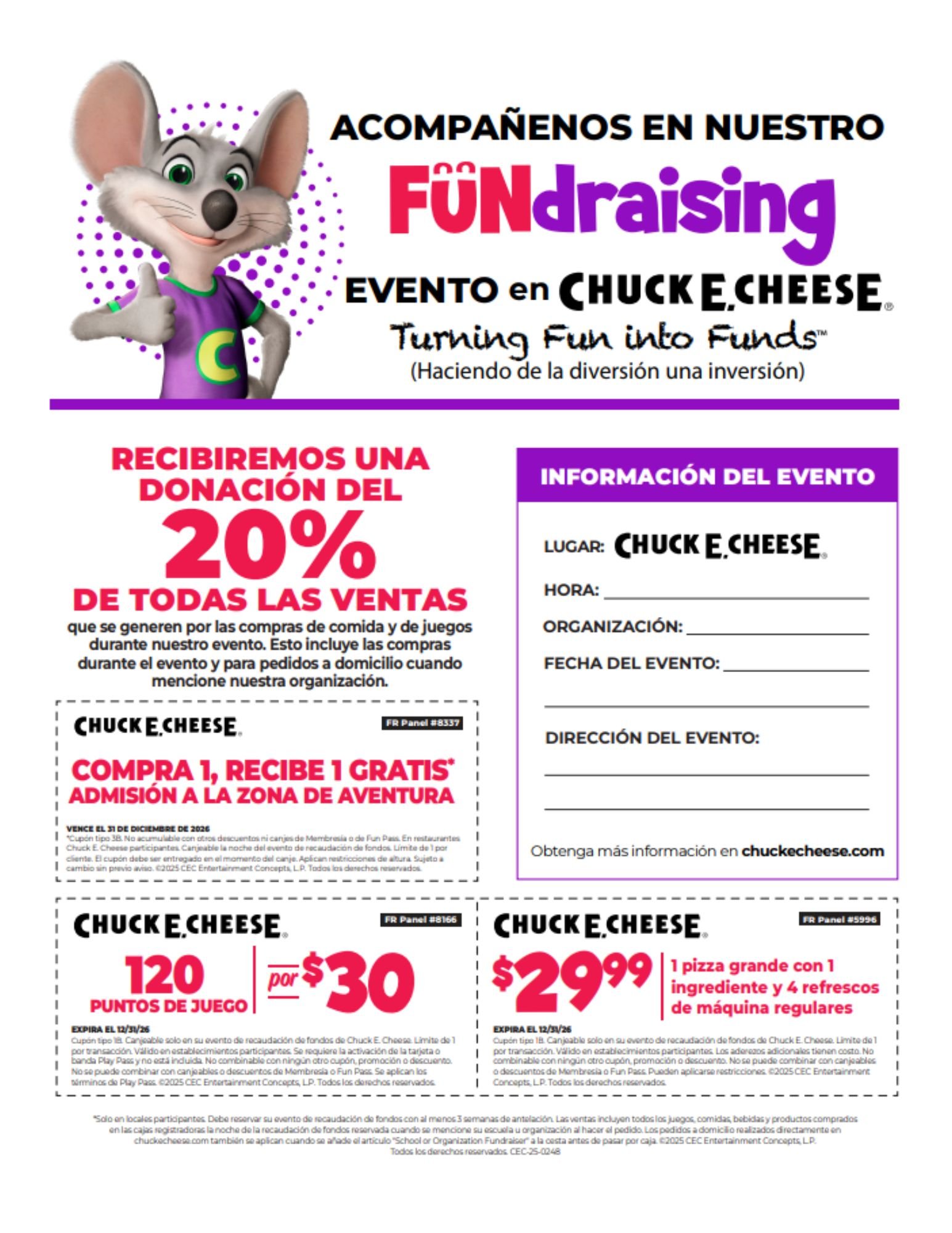 Back to All Events Chuck E Cheese Fundraiser Thursday, February 19, 2026 3:00 PM 9:00 PM Google Calendar ICS Bring your kids for a fun night of games, pizza, and friends! Chuck E Cheese will donate 20% of all Prussing sales to our PTO! Be sure to mention Prussing:)