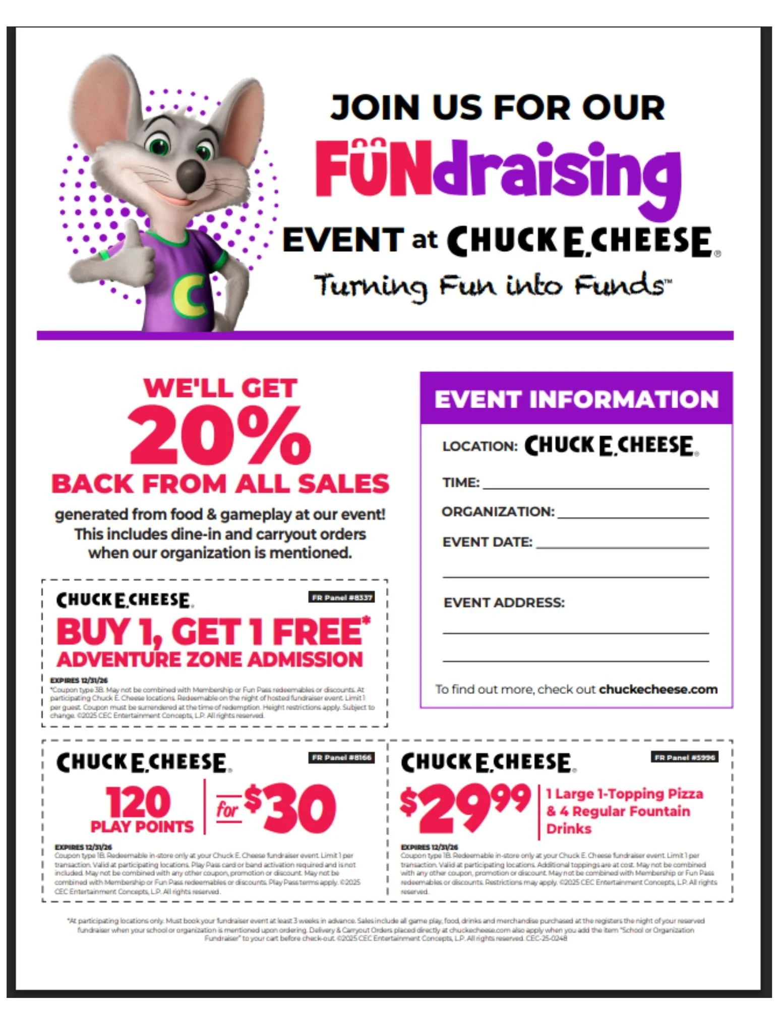 Chuck E Cheese Fundraiser Thursday, February 19, 2026 3:00 PM 9:00 PM Google Calendar ICS Bring your kids for a fun night of games, pizza, and friends! Chuck E Cheese will donate 20% of all Prussing sales to our PTO! Be sure to mention Prussing:)
